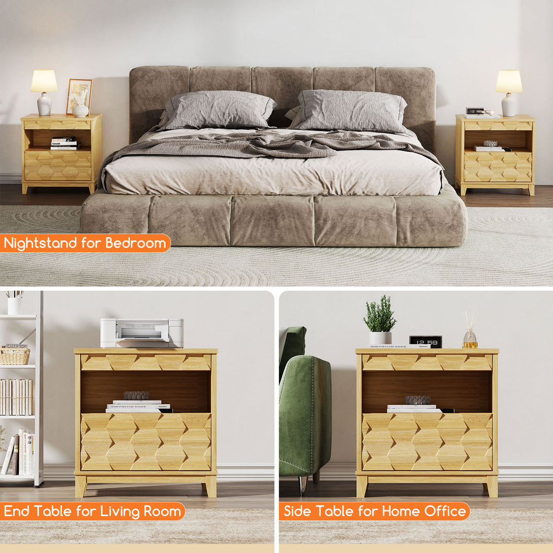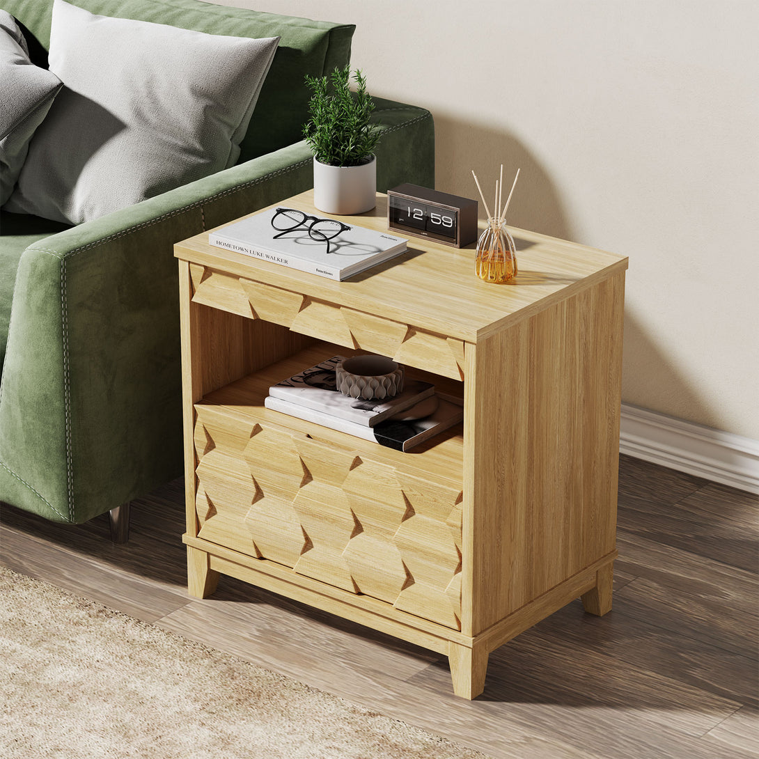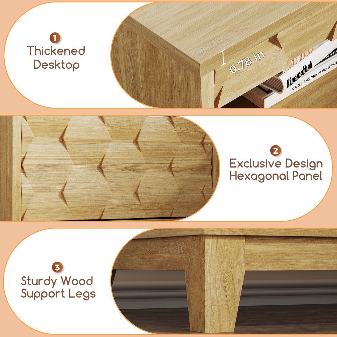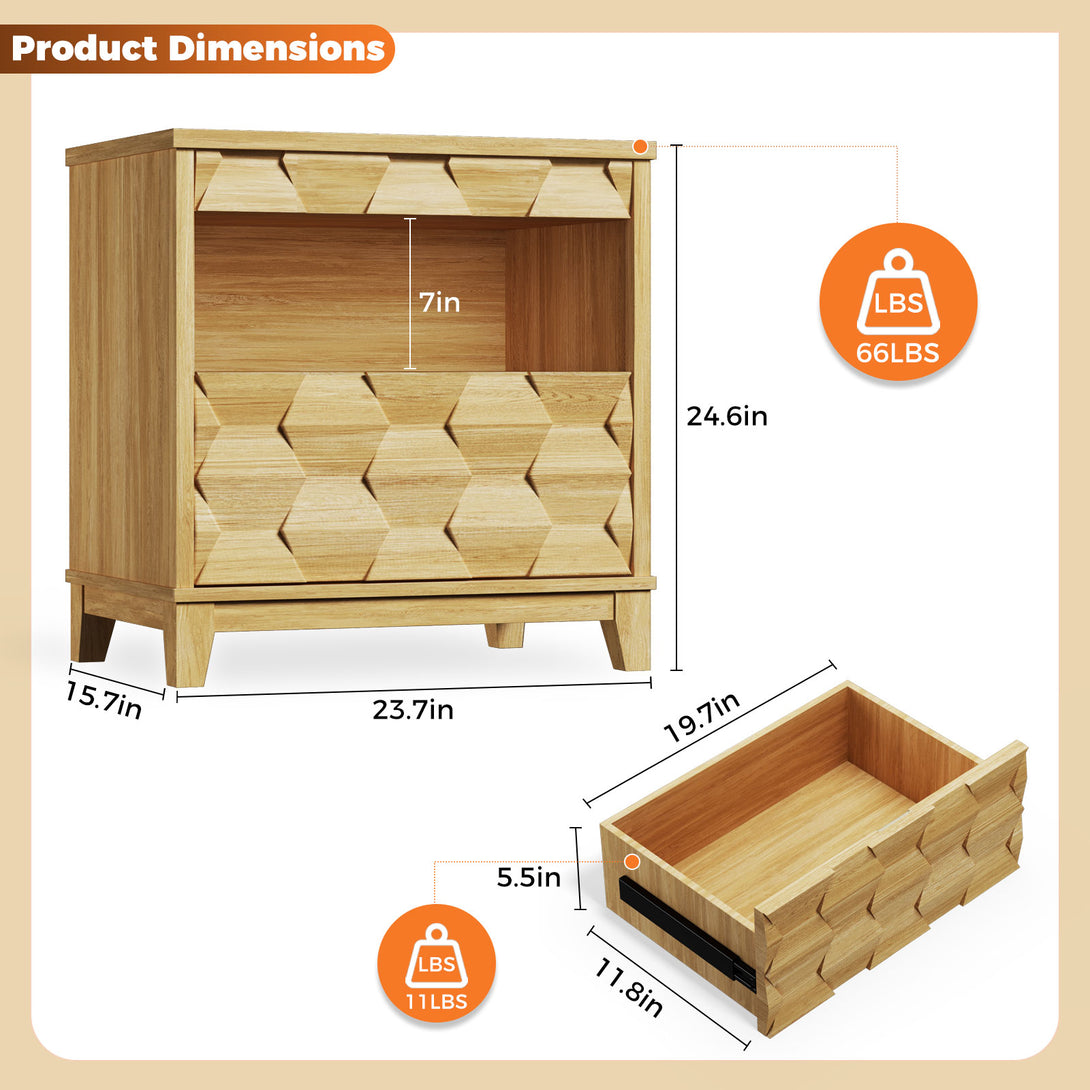 - Distinctive Texture Design: Elevate your bedroom aesthetic with eye-catchinggeometric texture on the drawers and a uniquely crafted sihouette. Supported byelegant solid wood legs in a versatile light wood finish, this nightstand makes asophisticated style statement.