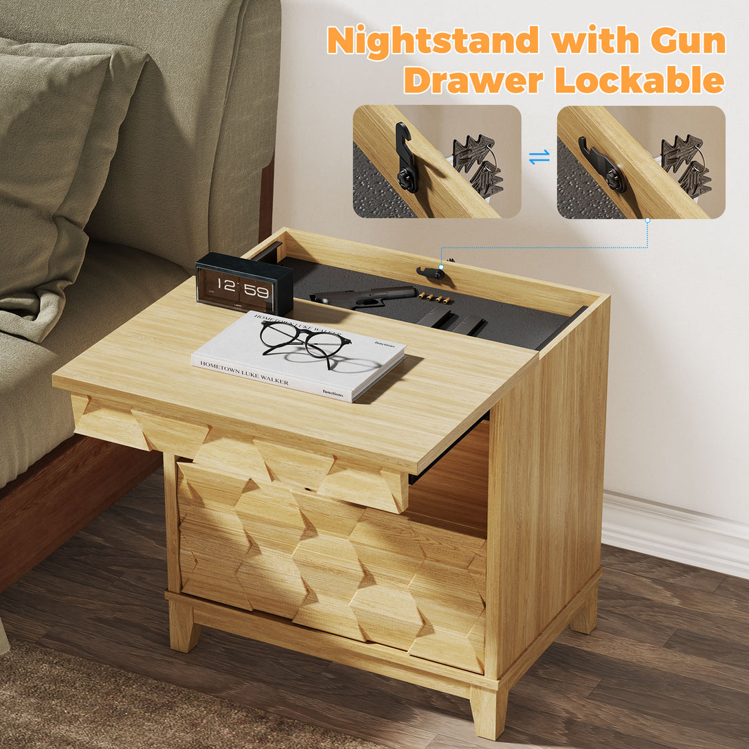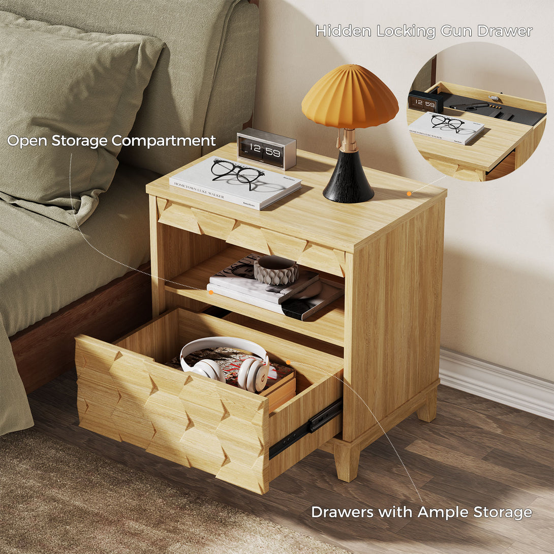 Nightstand with Gun Drawer, Modern Fluted Bedside Table with Unique 3-Dimensional Craf