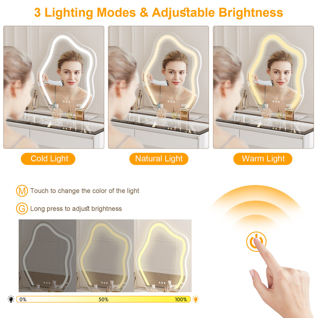 - 【3 Color LED Lights】The vanity desk features a lighted mirror with 3 color lighting modes, including natural, warm and cool light, brightness adjustment of 0-100%, provide perfect light for your makeup at any time and place.