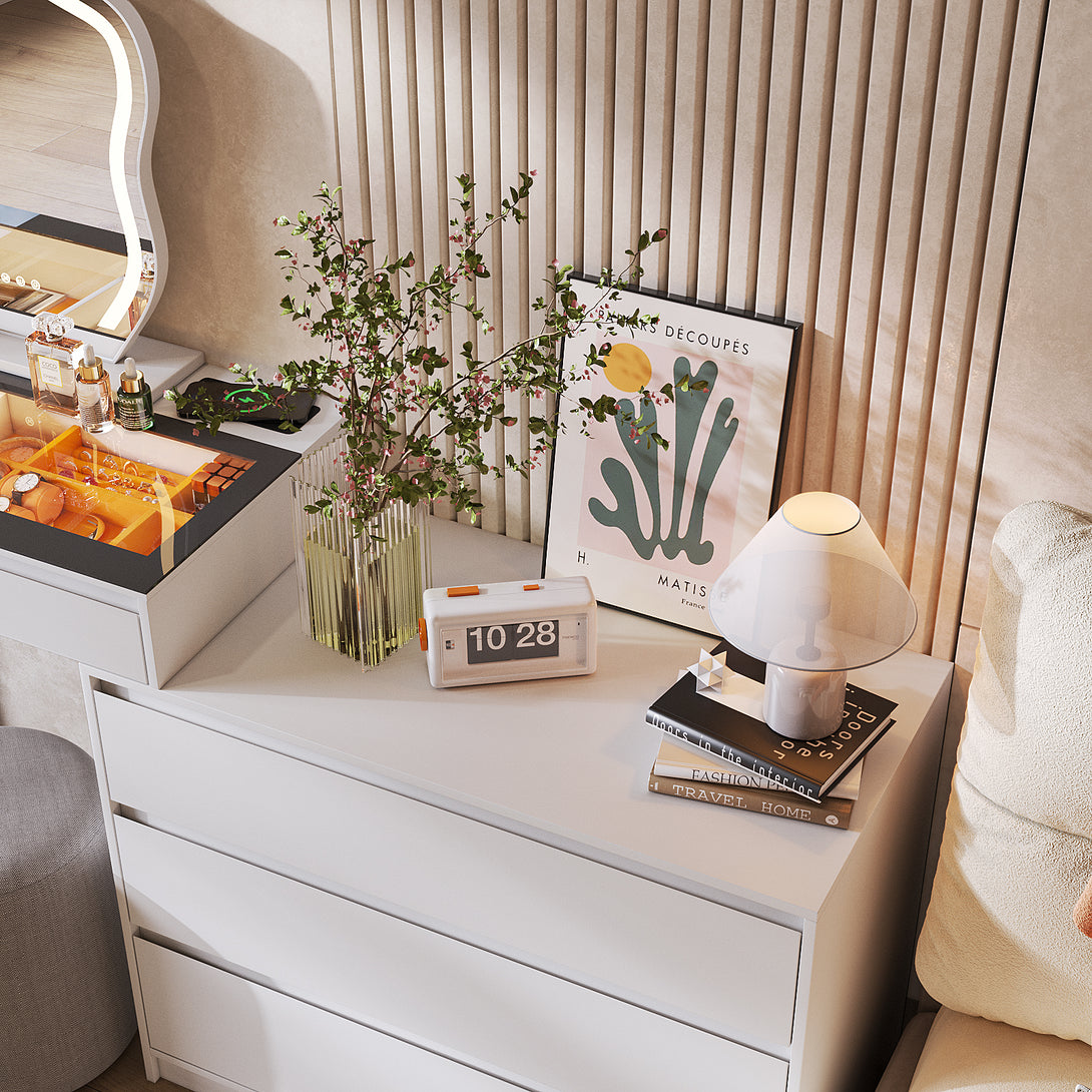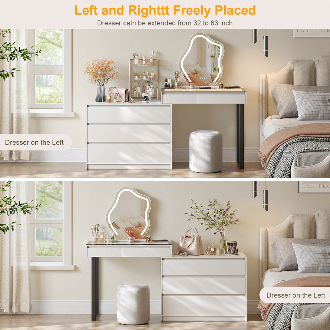 - 【Flexible Vanity Dresser Placement】With the option to install the side cabinet on the left or right to fit for your space and preferences, the length can be extended from 32" to 63". The human sensor lights auto turn on/off when detect human approach about 2-3m, also can be use as a bedside table.
