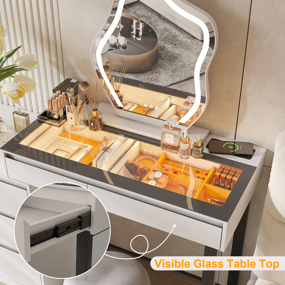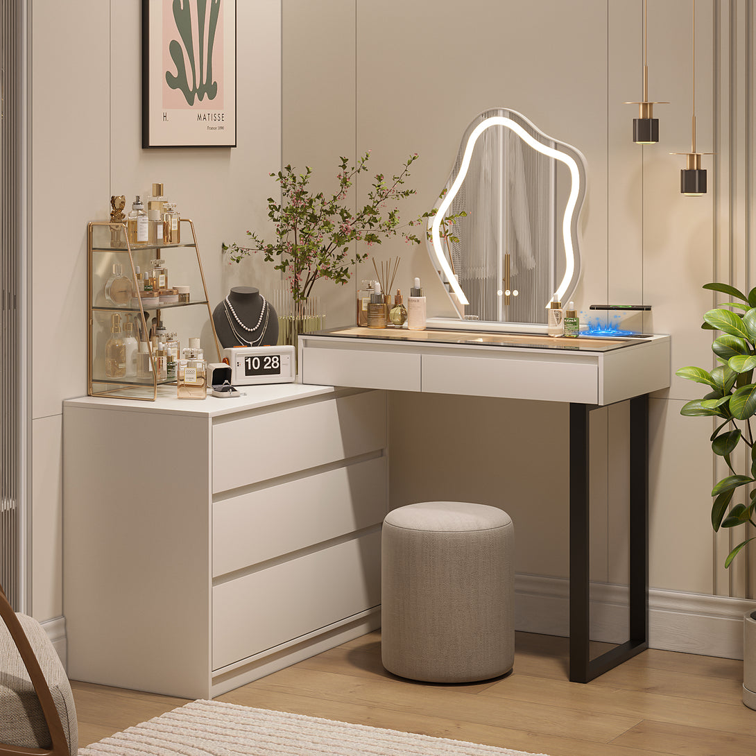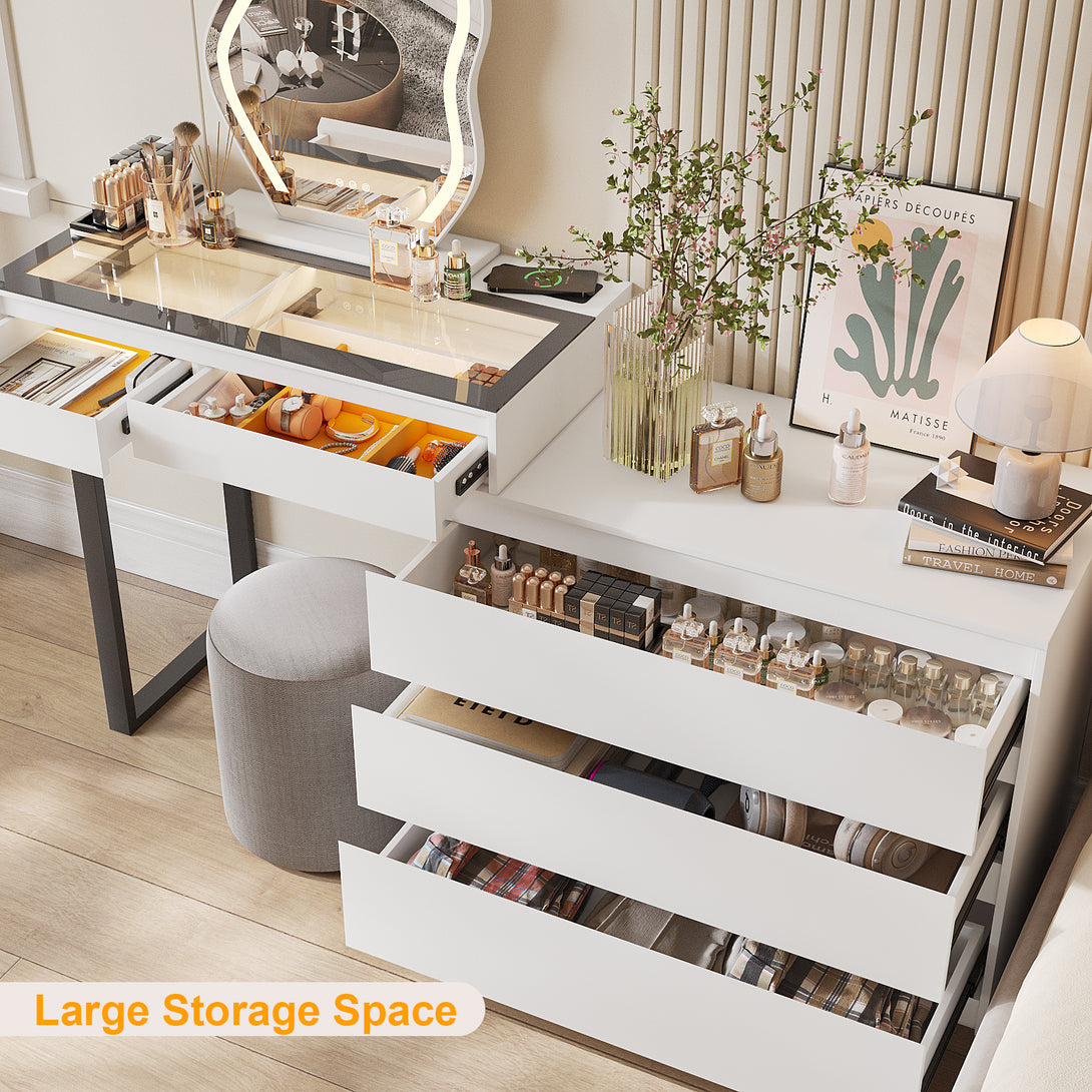 - 【Corner Vanity with glass top】62.5'' vanity dresser designed with a transparent glass table top with LED to display and store various cosmetics, perfumes, makeup brushes, hair straighteners, hair dryers, jewelry, etc.
